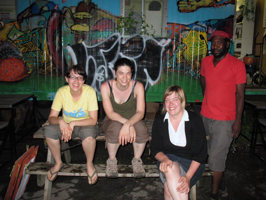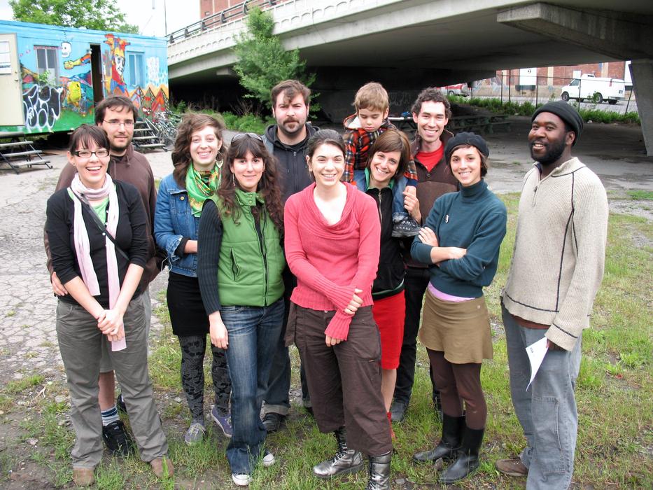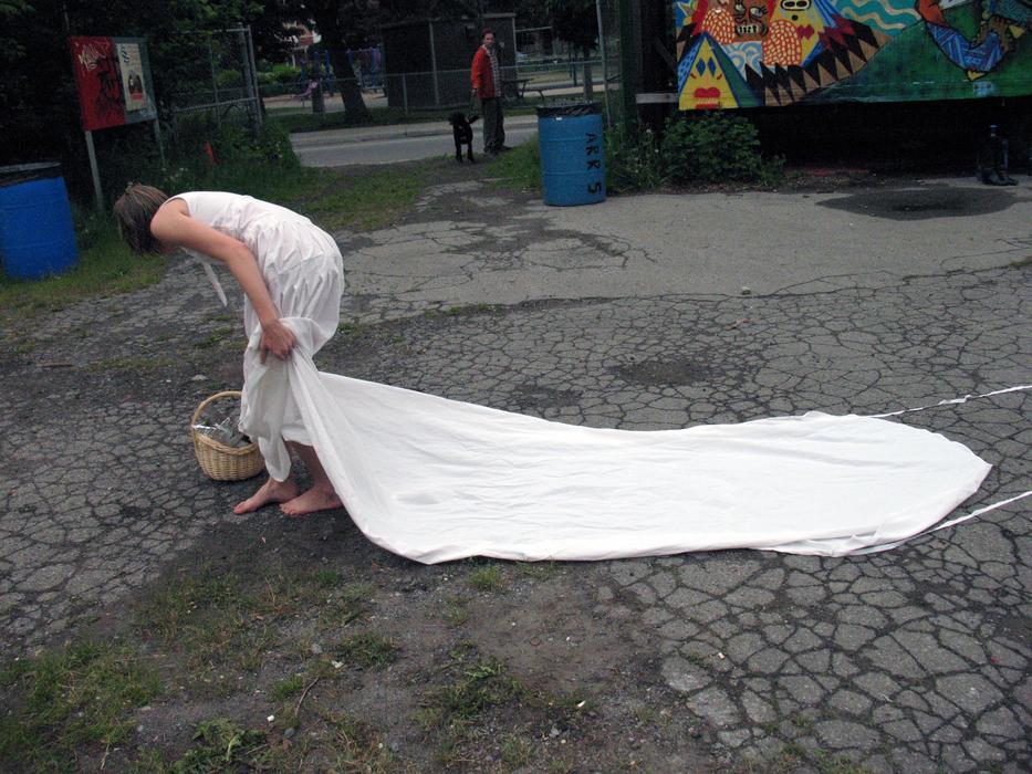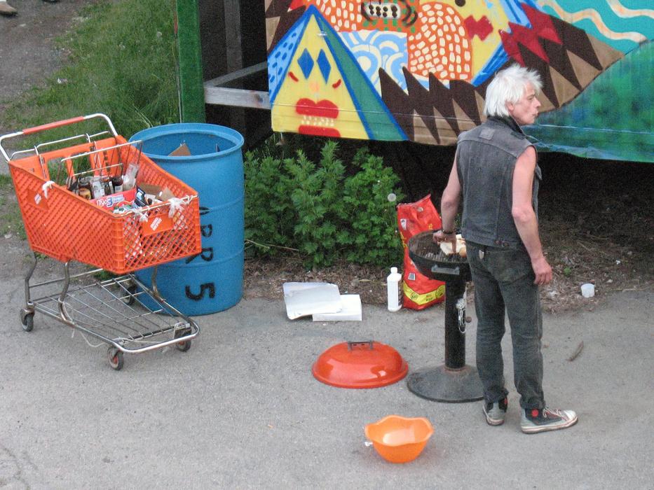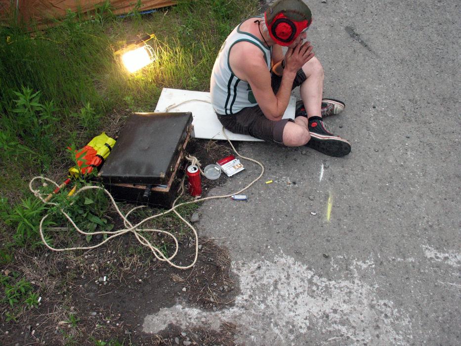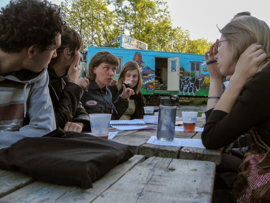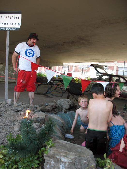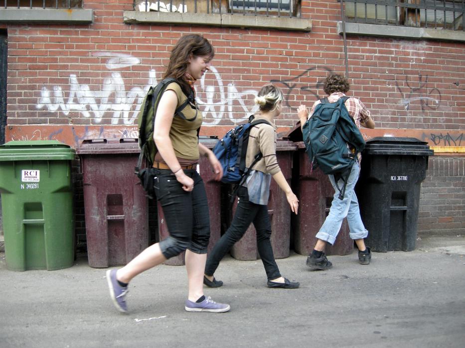 Lieu de repos et de ressourcement, le camping est aussi l’occasion de randonnées pédestres en forêt. Avec Promenade d’écoute de Yannick Guéguen et Edith Normandeau et Eating Your Way Through the Urban Campsite de Aidan Jeffery, les artistes proposent des promenades urbaines pour le moins inusitées. La première a pour objectif d’initier le public au paysage sonore à travers un trajet sensoriel d’expérimentation acoustique aux alentours du parc sans nom. Quelques détours permettent d’expérimenter différentes densités sonores: celle des oiseaux, de la ventilation d’une usine, de l’écho des voitures, du gravier sous nos pieds et des frottements de vêtements, par exemple. Force est de constater que le paysage visuel de la ville influence l’univers sonore qui nous entoure. De retour au campement d’Audiotopie (www.audiotopie.org), les participants sont invités à dessiner une partition à partir des sons entendus : étaient-ils rugueux, fluides, vaporeux? On réalise alors que les sons aussi ont une texture. La seconde promenade (de Aidan Jeffery) est un parcours pédestre préétabli en quête de nourriture dans les rebus des commerces du quartier Mile-End. Les campeurs urbains doivent ainsi s’approvisionner dans l’abondance « naturelle » qu’offre la ville, engageant une réflexion à la fois sur les stratégies de survie et les innombrables pertes associées aux modes de surconsommation qui régissent nos sociétés contemporaines. Comme les repas sont aussi prétextes aux rassemblements, les soupers sont préparés chaque jour collectivement avec les aliments «cueillis» dans le paysage urbain.