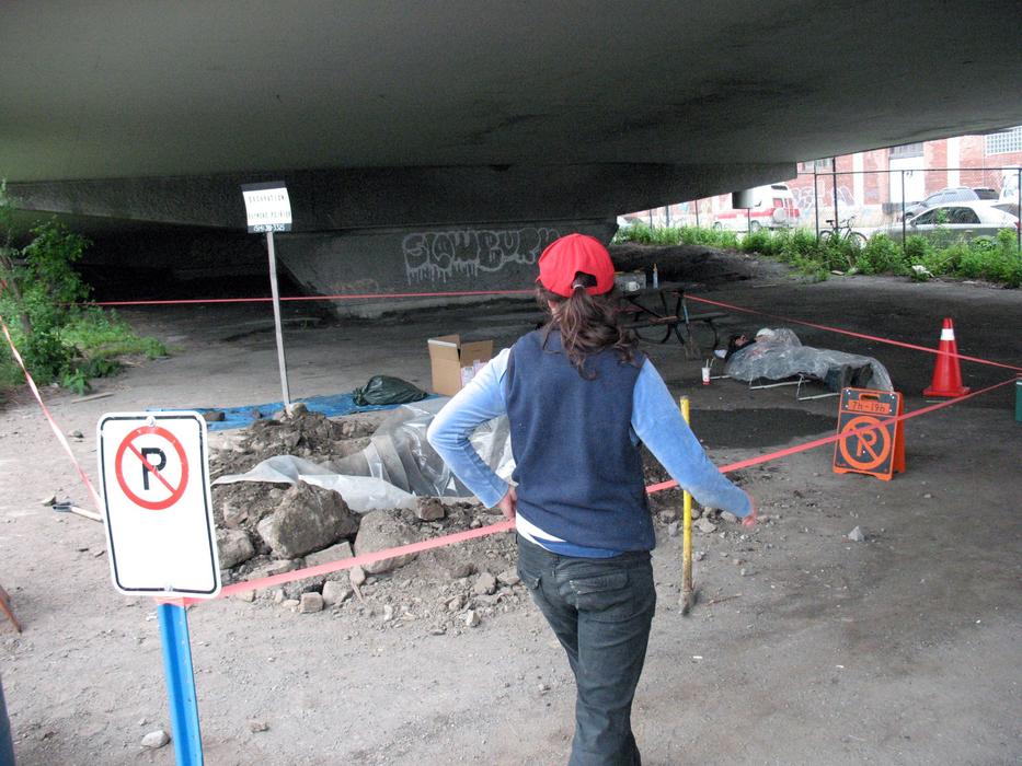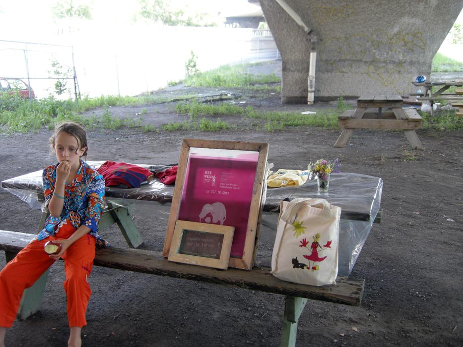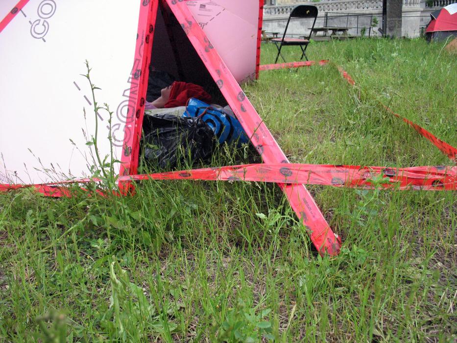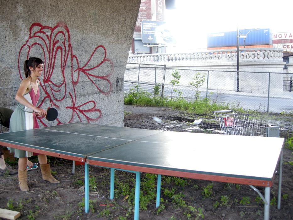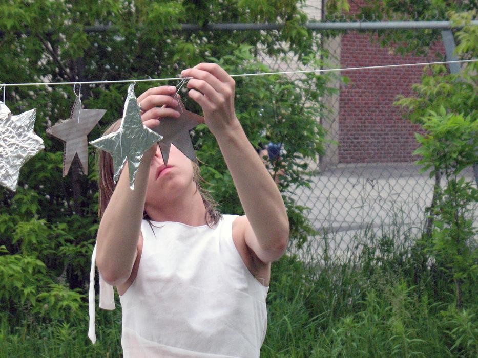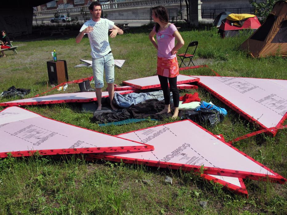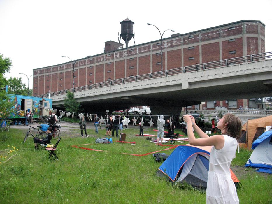 Selon jenna maclellan, le camping ne peut se vivre dans son intégralité sans un ciel étoilé : avec son installation Tant qu’il y a des étoiles/As Long as There Are Stars, elle propose des ateliers de fabrication d’étoiles en carton pour faire briller le site à la nuit venue. Vêtue d’une longue robe blanche, jenna accroche une à une ses étoiles sur un fil au-dessus des tentes pour créer l’illusion d’un ciel étoilé. Cette action rituelle, aussi minimale que poétique, souligne à la fois l’ironie du camping urbain et les enjeux de la pollution nocturne des grandes villes par la lumière, implicitement liée aux problématiques du réchauffement climatique. Avec le projet vidéo Pratiques provisoires/Survival Tactics, Gina Badger et Nika Khanjani interrogent aussi la réalité urbaine de façon critique en s’inspirant des camps de réfugiés pour élaborer de possibles stratégies de survies urbaines. Elles ont ainsi exploré le paysage environnant en quête de refuges temporaires : des lieux aussi caduques que le sommet d’un escalier de secours ou d’un parc de jeu traduisent les contradictions de l’environnement urbain et l’obsolescence des structures architecturales montréalaises en cas de pratiques provisoires obligées en état d’urgence. Les artistes ont projeté les prémisses de leur projet in progress sur les murs du viaduc Rosemont.