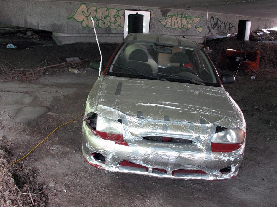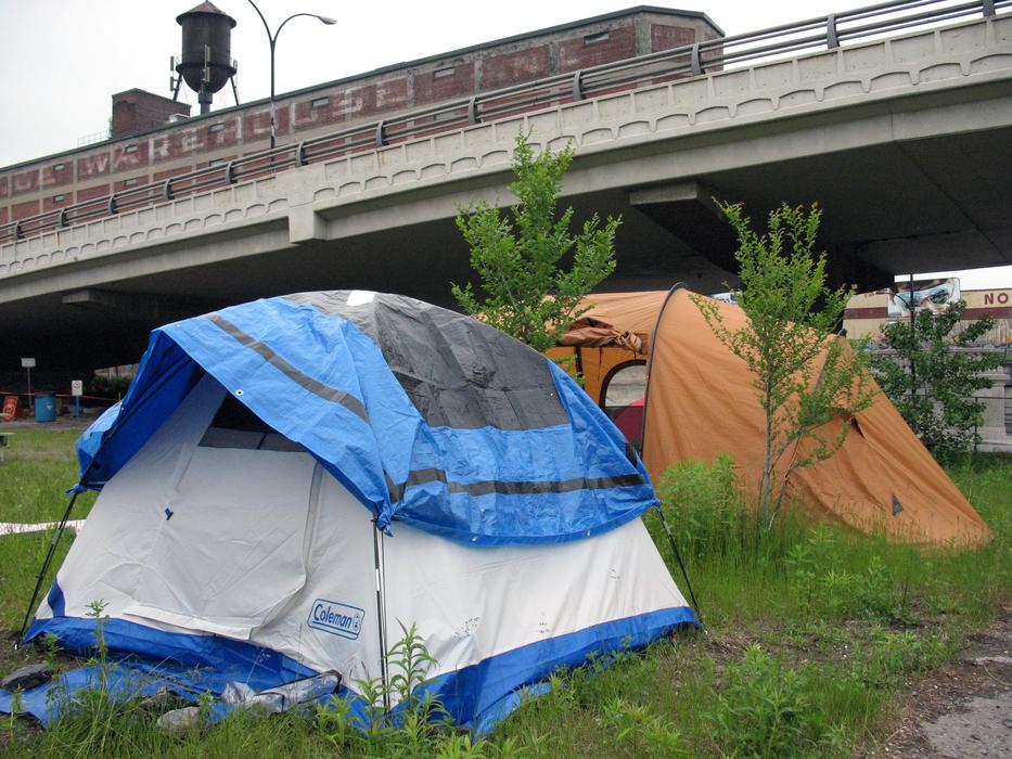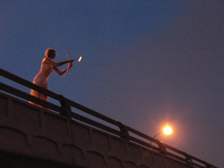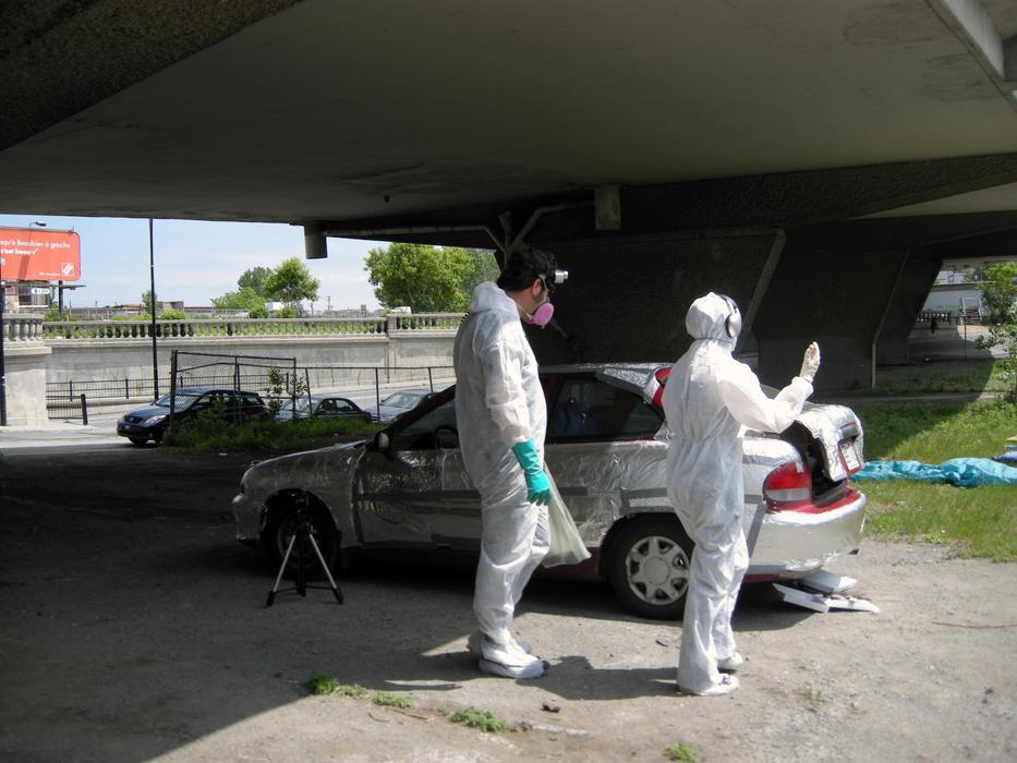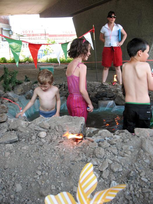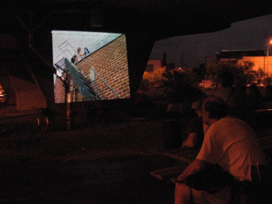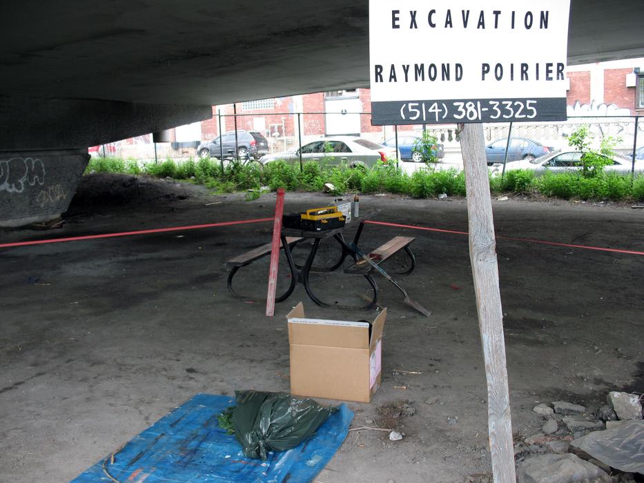 Selon jenna maclellan, le camping ne peut se vivre dans son intégralité sans un ciel étoilé : avec son installation Tant qu’il y a des étoiles/As Long as There Are Stars, elle propose des ateliers de fabrication d’étoiles en carton pour faire briller le site à la nuit venue. Vêtue d’une longue robe blanche, jenna accroche une à une ses étoiles sur un fil au-dessus des tentes pour créer l’illusion d’un ciel étoilé. Cette action rituelle, aussi minimale que poétique, souligne à la fois l’ironie du camping urbain et les enjeux de la pollution nocturne des grandes villes par la lumière, implicitement liée aux problématiques du réchauffement climatique. Avec le projet vidéo Pratiques provisoires/Survival Tactics, Gina Badger et Nika Khanjani interrogent aussi la réalité urbaine de façon critique en s’inspirant des camps de réfugiés pour élaborer de possibles stratégies de survies urbaines. Elles ont ainsi exploré le paysage environnant en quête de refuges temporaires : des lieux aussi caduques que le sommet d’un escalier de secours ou d’un parc de jeu traduisent les contradictions de l’environnement urbain et l’obsolescence des structures architecturales montréalaises en cas de pratiques provisoires obligées en état d’urgence. Les artistes ont projeté les prémisses de leur projet in progress sur les murs du viaduc Rosemont.