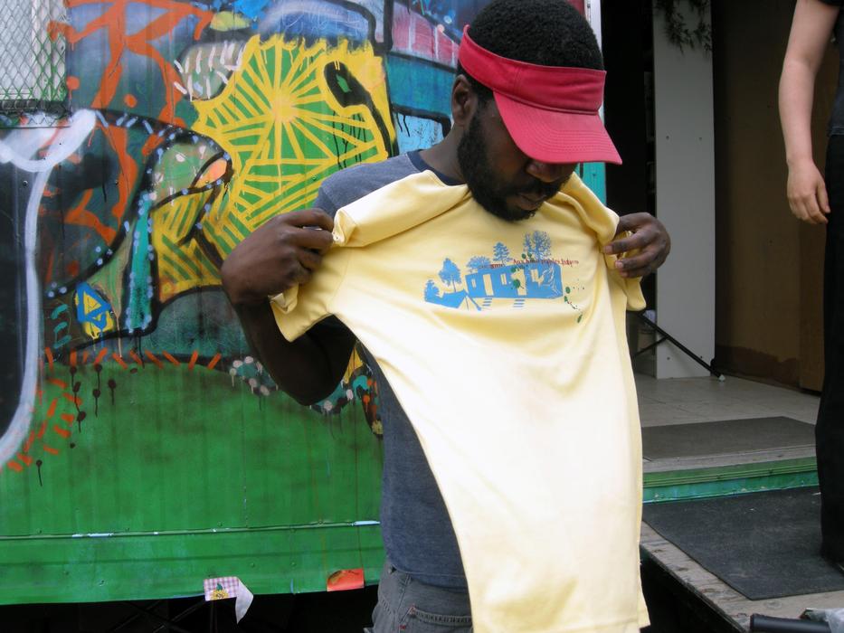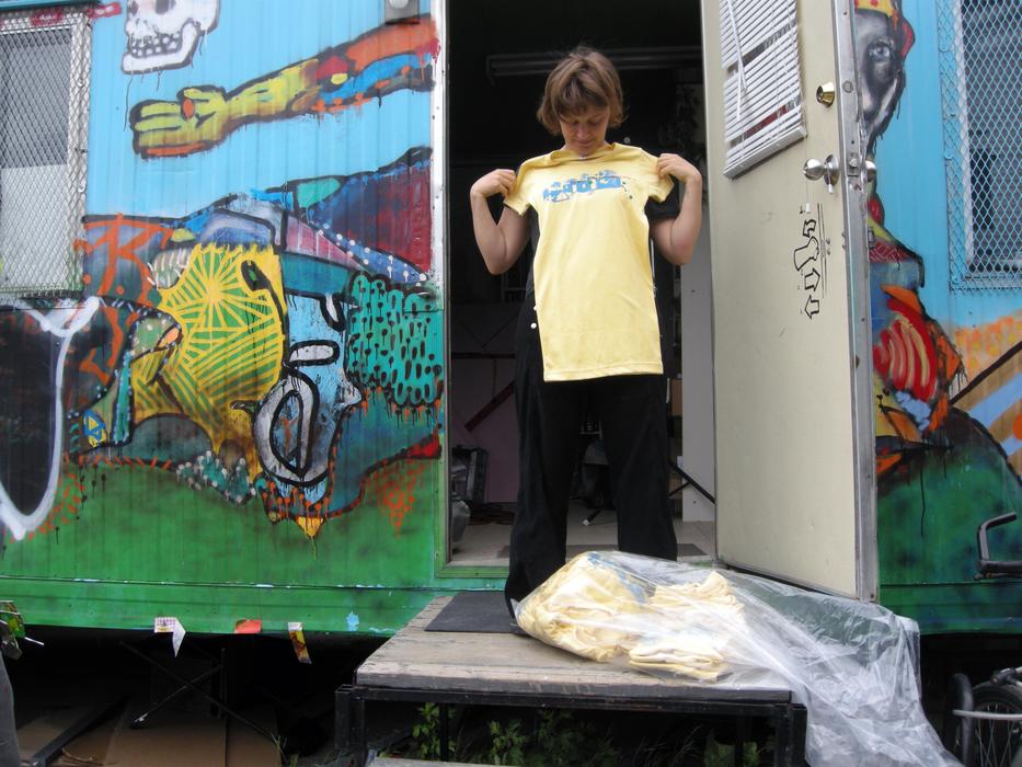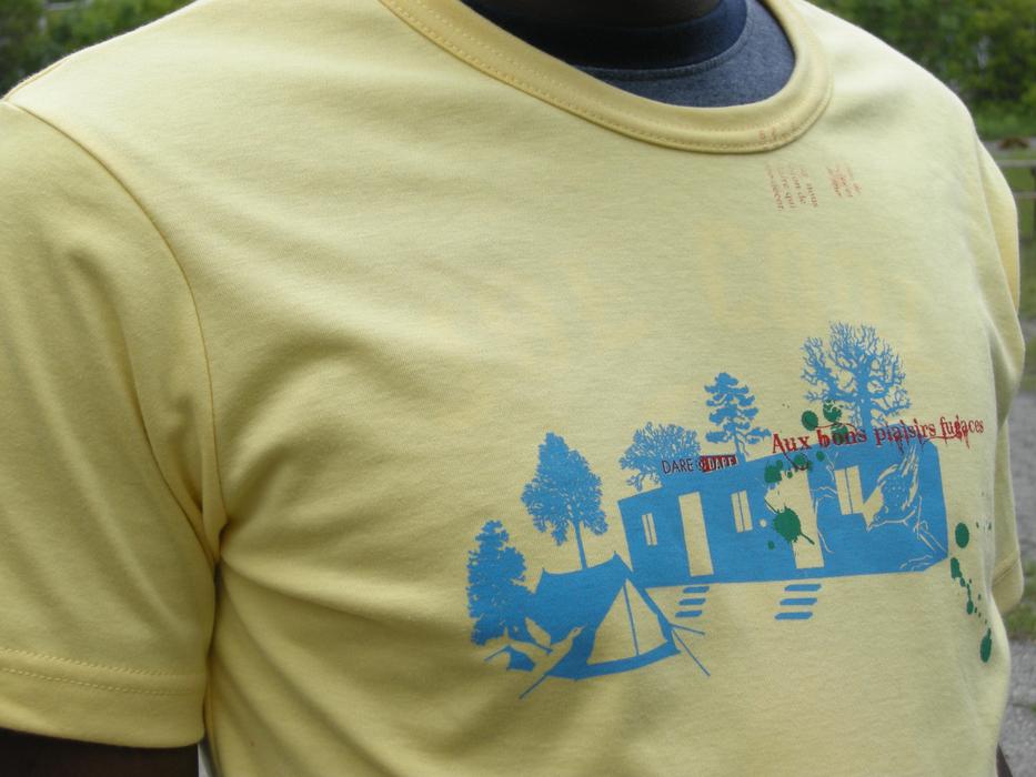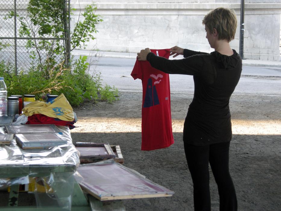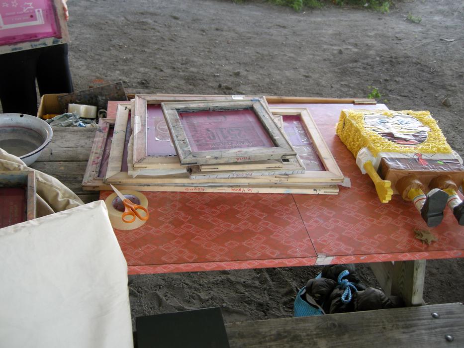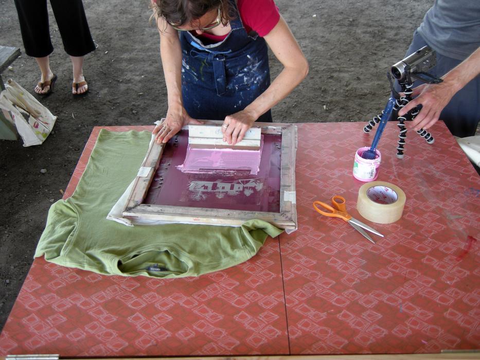 Installation d’une table à sérigraphie sur le site du camping. Impression de mots et dessins en direct sur les vêtements qu’apporteront les visiteurs.
