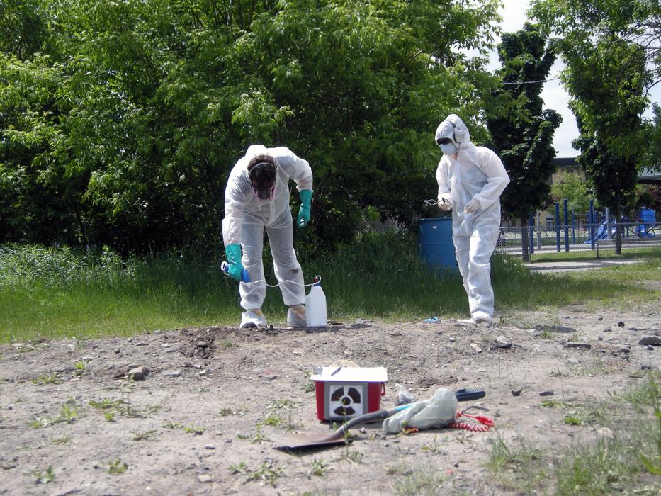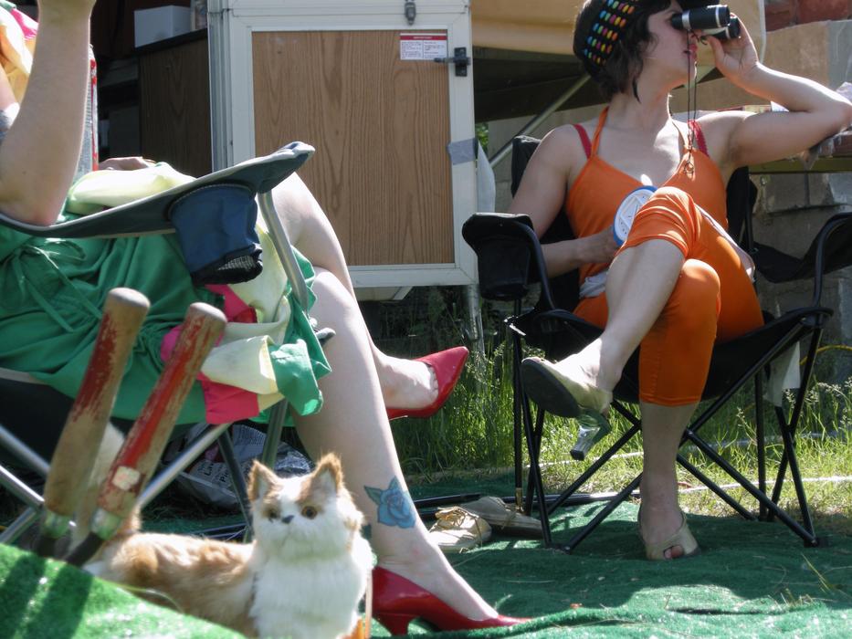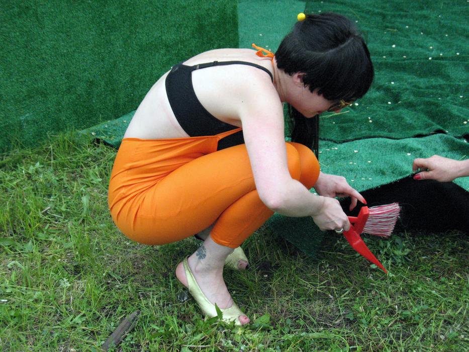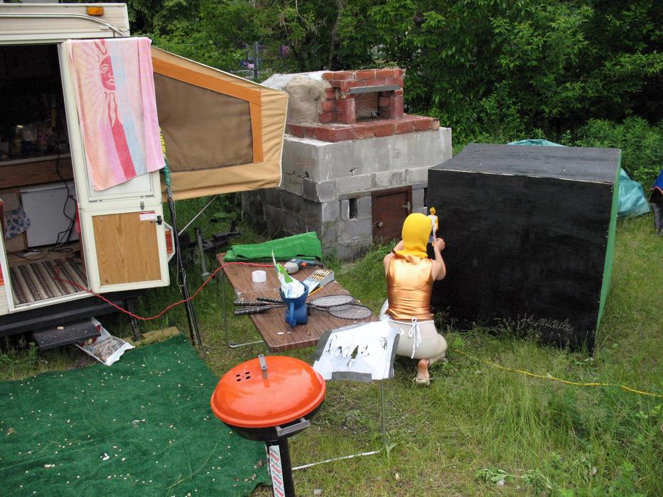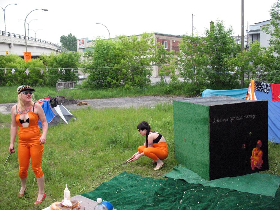 Avec pour prémisse le camping récréatif comme lieu populaire où se cotoîent des individus, toutes conditions sociales confondues, Julien Poirier et Nancy R. St-Laurent explorent avec humour et légèreté ces stéréotypes en interprétant tour à tour différents métiers participant à l’élaboration du projet Underground, de l’arpentage à l’inauguration du trou. Ainsi, l’escouade scientifique, vêtue d’une combinaison blanche et munie d’outils insolites, procède à la décontamination du terrain : «est-ce que vous sondez réellement le terrain?», «le lieu est-il contaminé pour vrai?» leur demandait-on. Puis, deux ouvriers de la firme Raymond Poirier (les noms de famille respectifs des artistes) effectuent les travaux d’excavation avant que les sauveteurs aquatiques innondent le trou et veillent à la sécurité des lieux. Enfin, un discours annonce l’inauguration officielle de cette piscine improvisée mise à la disposition des campeurs et qui, par ailleurs, a fait le bonheur des enfants! Jouant d’une autre manière sur les clichés de nos souvenirs d’enfance, Joëlle Couturier investit le lieu à rebours en créant une mise en scène surréaliste où se côtoient différents tableaux performatifs autour de la roulotte comme espace de rencontre. Avec Dites-moi que vous m’aimez, je miaule (séduisez-vous les uns les autres), elle procède à des actions ponctuelles, aussi loufoques que banales, où elle engage le dialogue dans un esprit de séduction de l’espace et du spectateur. Elle confectionne, par exemple, une clôture à l’aide de bâtons de popsicle autour de sa demeure mobile, joue au badminton en talons hauts ou encore, caresse un chat empaillé. L’artiste offre aussi au public des petites «boîtes à séduction» décorées de sérigraphies en échange d’un objet personnel: mais sous leur apparence séduisante, celles-ci contiennent en réalité des mégots, des restes de nourriture et autres déchets. À la soirée de clôture, «matante Joëlle» partage sa recette familiale de chair à saucisses, sous les yeux ébahis des visiteurs et des autres campeurs. Frôlant le spectacle, le kitsch et l’extravagance, elle incarne en quelque sorte le pendant des acteurs de Underground. En effet, les deux installations mêlent le ludique et l’absurde pour créer de véritables fictions qui détournent la définition du camping ancrée dans l’imaginaire populaire.
