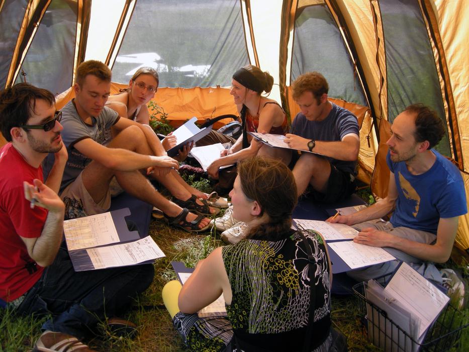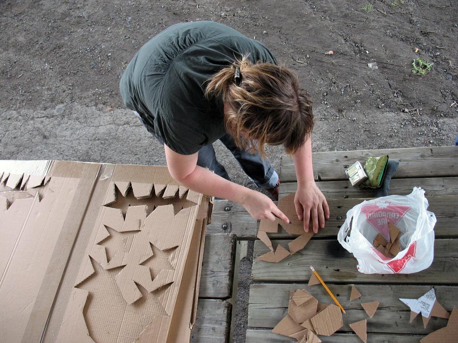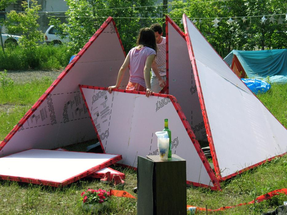 Construction en soirée d’une tente avec comme point de départ les formes du tangram chinois. Jeu tangram avec les visiteurs et les campeurs durant la journée.