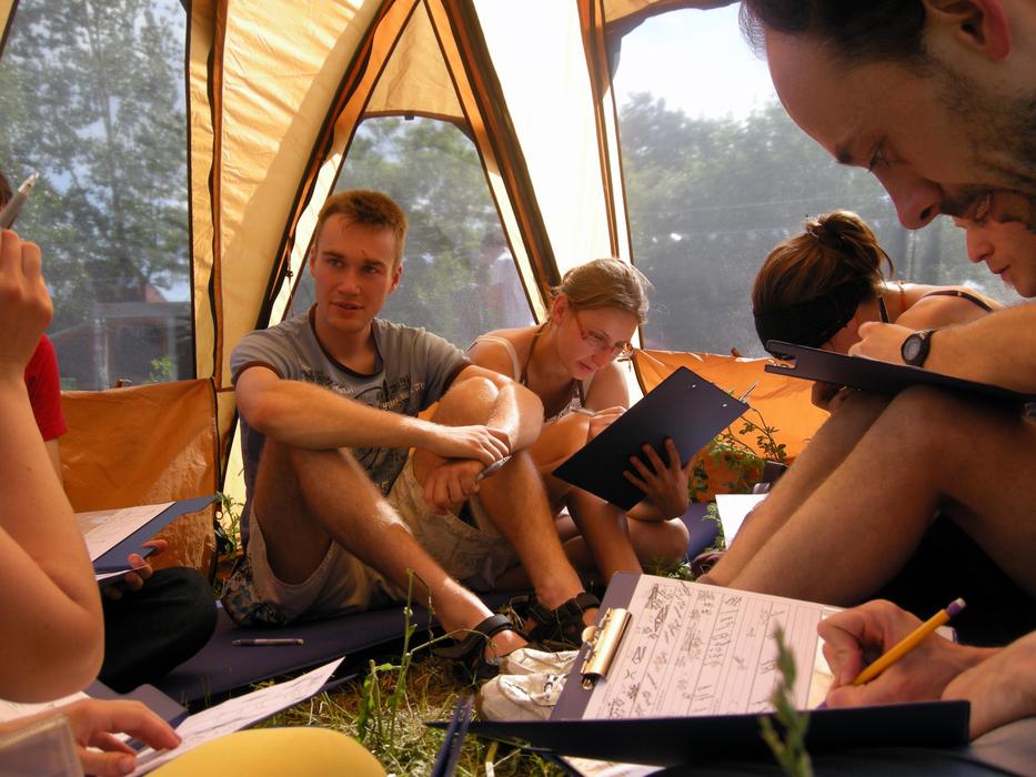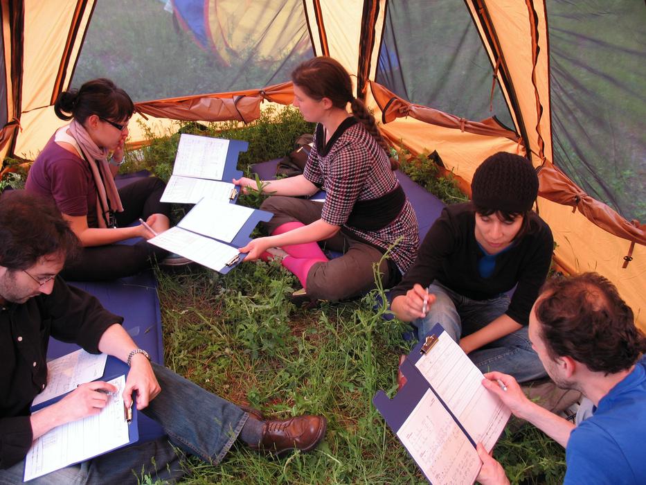 Randonnées pédestres aux alentours du camping avec comme objectif la caractérisation des sons ambiants par des exercices d’écoute. Création d’une «partition» sonore suite aux parcours. Installation d’un camp scientifique. Départ des promenades à partir du camping et du métro Rosemont.