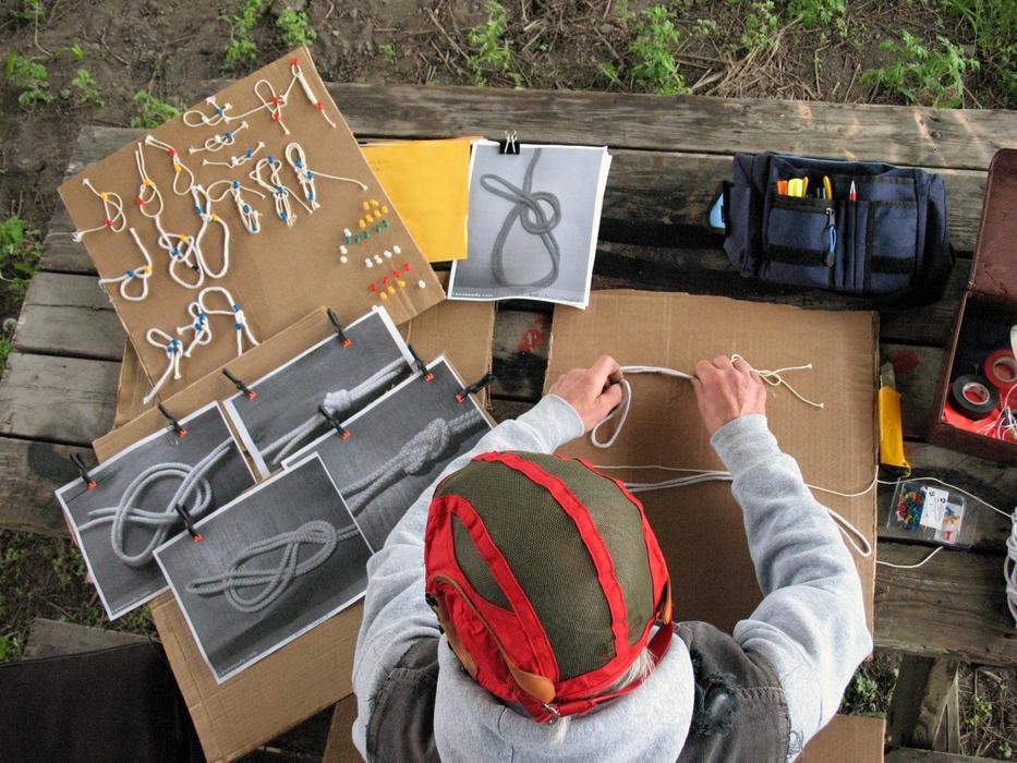 Installation d’un comptoir de noeuds sur le site du camping visant à faire découvrir l’utilité et la variété des noeuds existants. Série de jeu performatifs autour de l’idée Je ne fais que passer, témoignant du caractère éphémère de l’action du camping.