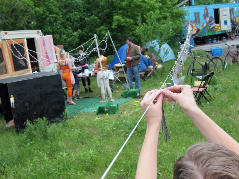 D’autres jeux et animations sont aussi au rendez-vous pour distraire les campeurs. Tenter l’impossible ou tangram à domicile de Gabriel Dufresne et Émilie Plank suggère la création d’un espace de camping modifiable inspiré du tangram : ce jeu d’origine chinoise consiste à créer différentes figures à l’aide de 7 pièces de formes géométriques. Pendant le jour, ils invitent le public et les autres campeurs à jouer à ce tangram géant fait de panneaux isolants en styromousse et, chaque soir, ils construisent une œuvre tridimentionnelle différente qui leur sert d’abri. Éphémère et modifiable, comme les paysages rencontrés par le campeur voyageant d’un lieu à l’autre. Avec son installation Comptoir de nœuds, Rodolphe-Yves Lapointe convoque les gens à confectionner différents types de nœuds avec des bouts de corde, symbolisant les relations qui se créent entre les campeurs; le nœud étant le «signe sensible du lien, autrement invisible, existant entre les membres de la communauté spontanément réunie autour de l’évènement», selon l’artiste lui-même. Sa performance Je ne fais que passer anime la soirée des campeurs en s’inspirant du rébus à action (Jeu – Nœuds – Fée – Queue – Pas – C) : alliant gestes, représentation graphique et code morse, Rodolphe revêt son bonnet de poète « langagier engagé » en évoquant le caractère passager du camping comme celui, éphémère, de la vie. Le kiosque de sérigraphie ¿Si no hay techo, que hay? (S’il n’y a pas de toit, y a quoi?) de Pascaline Knight joue, lui aussi, avec les mots : les gens apportent leurs vêtements et accessoires pour y faire imprimer des mots, des textes et des images, fixant sur le tissu les mémoires de l’évènement.
