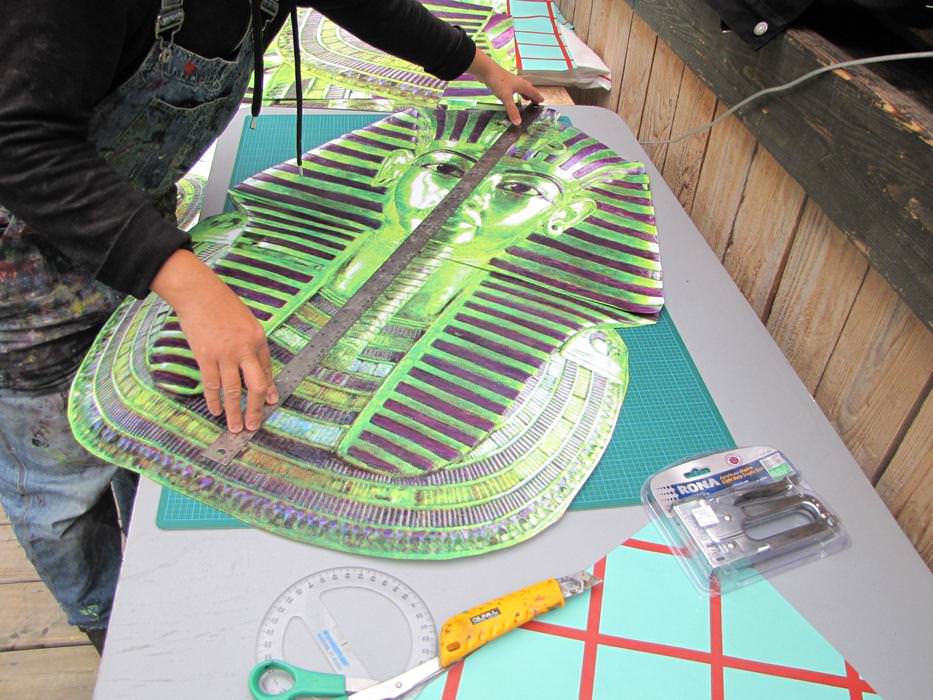 Fidèle à sa pratique teintée d’humour, Dominique Pétrin joue encore une fois avec de multiples symboles graphiques et fait se côtoyer de manière éclectique des références historiques et culturelles diverses. Les couleurs chatoyantes et saturées, les effets optiques générés par la rencontre de lignes géométriques, l’amalgame exubérant de motifs [zébrures, pierres précieuses, marbres, jacquards, masques funéraires égyptiens] contribuent chacun à l’aspect baroque de cette composition.