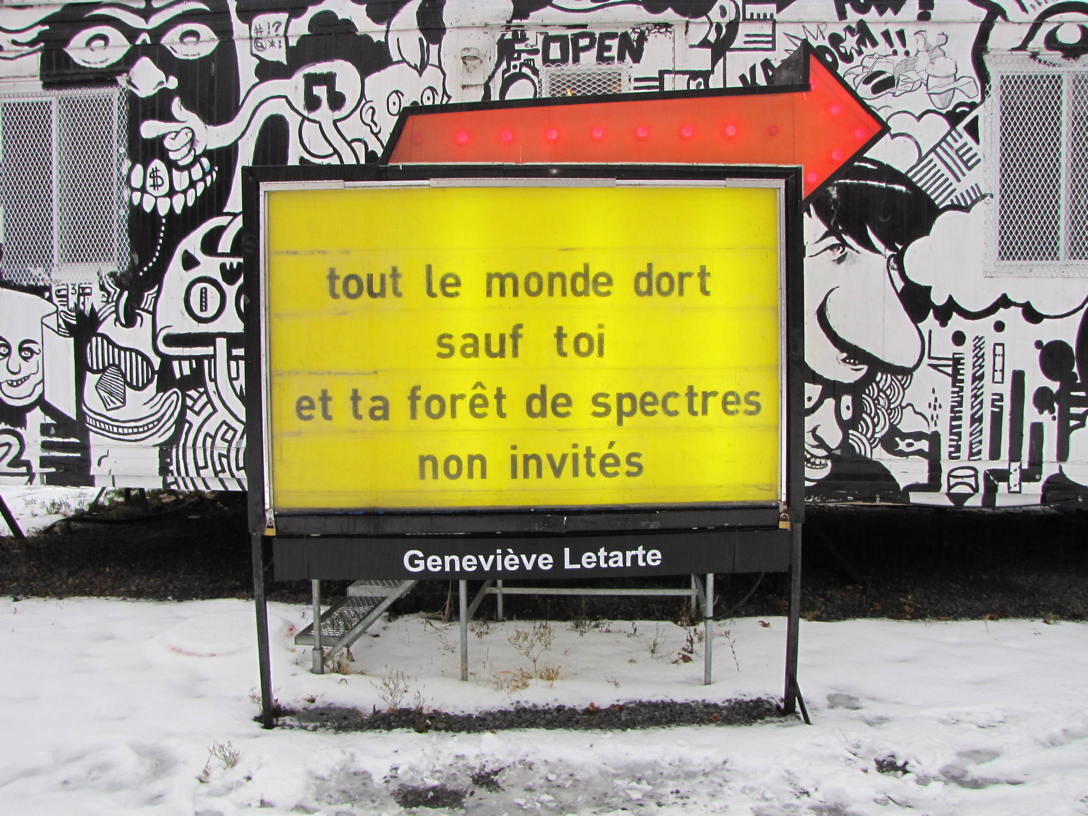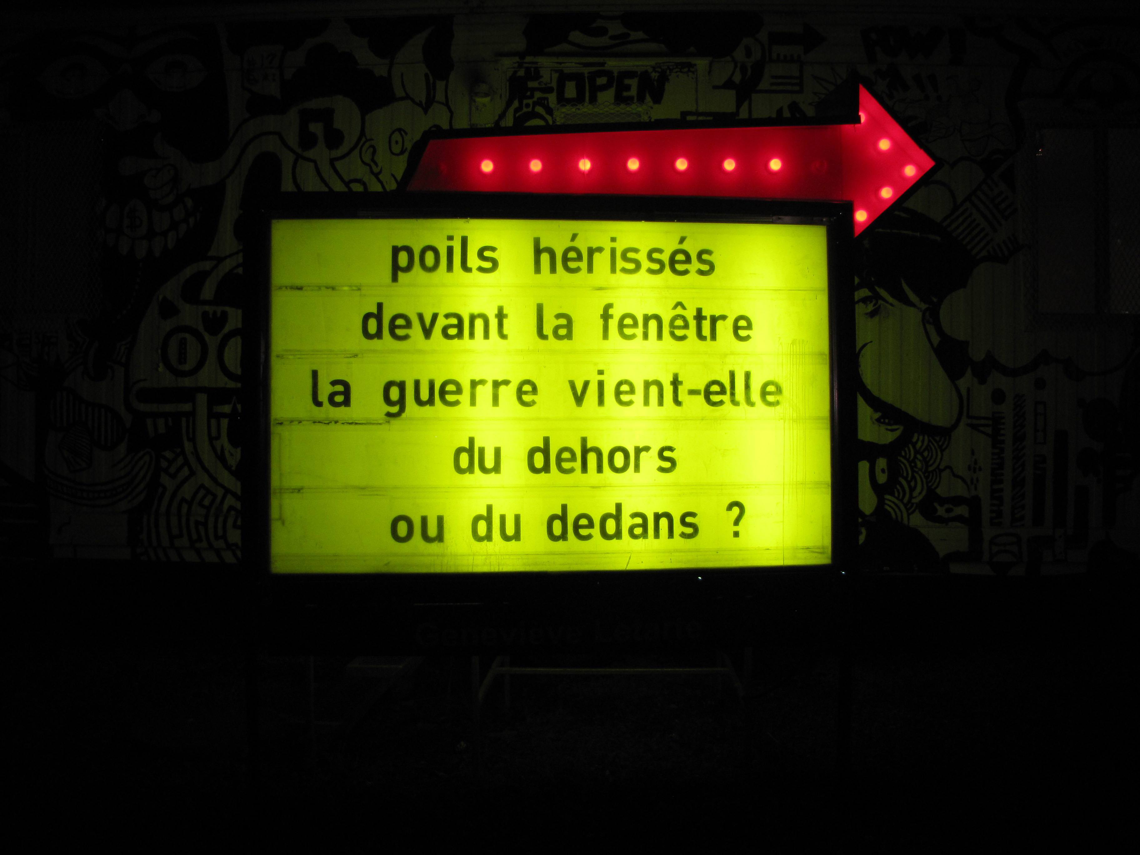 Je trouve aussi très inspirante l’idée de diffuser des poèmes sur un panneau lumineux installé dans un lieu public. J’ai toujours eu la conviction que la poésie, malgré le caractère intime qu’on lui prête et l’aspect hélas souvent confidentiel de sa diffusion, est en fait très liée à l’espace public et à la collectivité. Pour avoir participé à de nombreux événements poétiques, j’ai souvent constaté à quel point la poésie est rassembleuse, permet une forme de partage à la fois immédiat et durable. À titre de spectatrice, je suis toujours ravie de voir la poésie s’immiscer dans les lieux publics : poèmes affichés dans les autobus ou le métro de Montréal, lectures se déroulant dans des lieux inusités tels que parcs ou vitrines de magasins, etc.