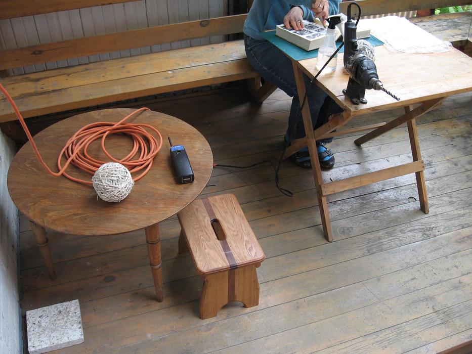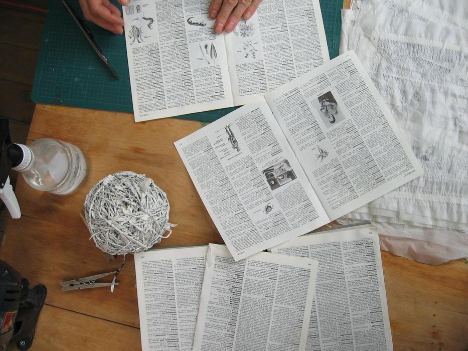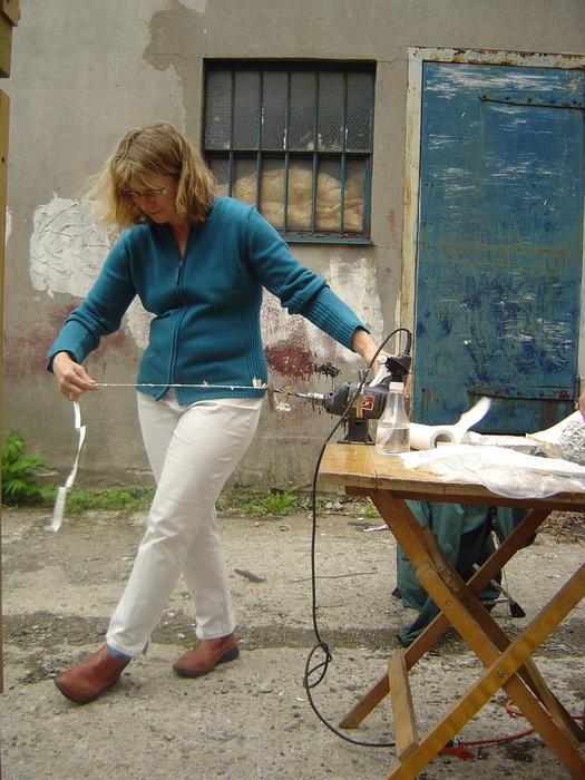 Karen Trask, avec son sourire soyeux, accueillait les visiteurs en leur offrant le spectacle de son travail. Postée à l’entrée de la cour donnant sur le hangar, elle filait les pages du dictionnaire Larousse avec une perceuse, enroulait une série de mots et la mémoire symbolique qu’ils transportent. Ce travail reprenait un autre amorcé quelques années plus tôt par l’artiste à la Biennale internationale de lin de Deschambault.