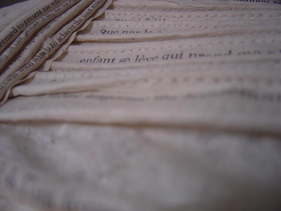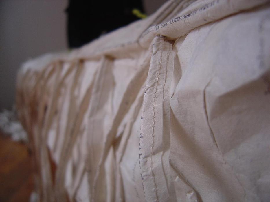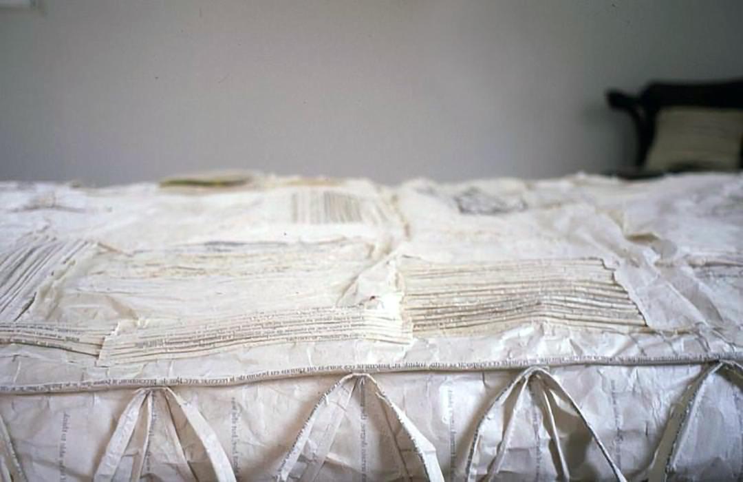 Rappelons ici que Proust écrivit la majeure partie de son œuvre allongé dans son lit dont Karen nous offrait une reproduction photographique au rez-de-chaussée qui constituait une salle d'attente. À l'étage, le lit était là, il prenait toute la place. Ce n’était pas un meuble, c’était une présence sourde. Dans le coin qui oppose le lit se trouvait un fauteuil, une petite table avec le cahier de travail de l’artiste et un coussin de mots, accessoire complémentaire qui parlait plus du savoir-faire que de l’œuvre. Le lit était splendide et son rendu magnifique. L’objet qu’elle produisit durant quatre mois de travail respirait une finesse qui embaumait tout l’espace d’exposition. Habité d’une présence fantomatique discernable aux contours d’un corps froissé dans le papier, le lit dégageait un vécu qui le rendait presque intemporel et animait des fantasmes le rendant plus vrai que le véritable lit de Proust.