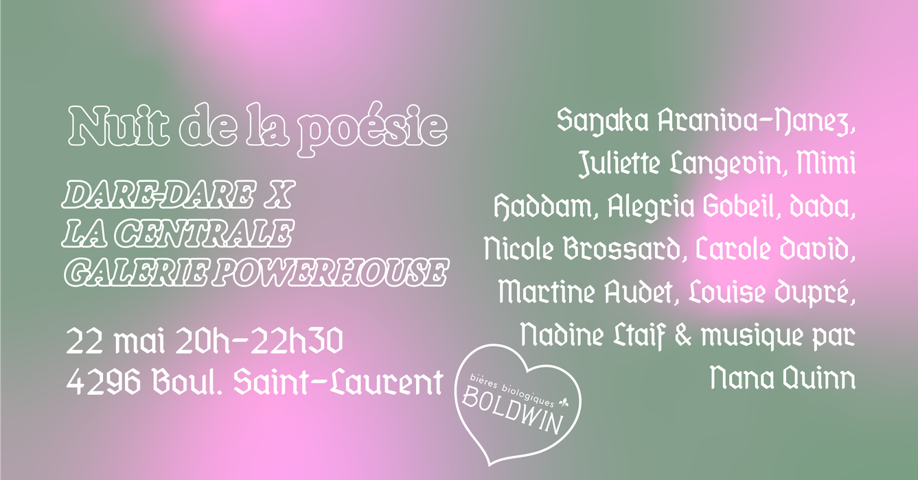 À l’occasion du 40ème anniversaire de DARE-DARE et du 50ème anniversaire de La Centrale galerie Powerhouse, les deux centres d’artistes se retrouvent afin de réinterpréter leur ancien projet collaboratif "Les après-midi littéraires". Cette série de lectures féministes ayant eu lieu entre 1992 et 1994 a vu passer les écrits de plusieurs poètes phares de la littérature québécoise. Cette soirée est l’occasion de les retrouver de nouveau, accompagnées cette fois-ci de poètes émergent·e·s qui marquent déjà par leurs écrits.