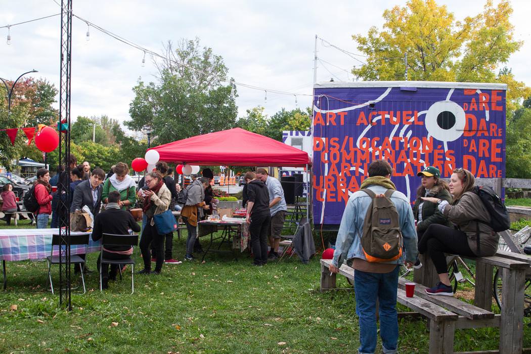 La journée se terminera par une soirée festive lors de laquelle les artistes et les participants sont conviés à se retrouver afin d’échanger et de mieux connaître le milieu des arts visuels et quelques uns de ses acteurs. Cette soirée à lieu à l’abri-mobile de DARE-DARE situé sur le terrain avoisinant le marché Atwater, dans le triangle formé par les avenues Atwater, Greene et la rue Doré.