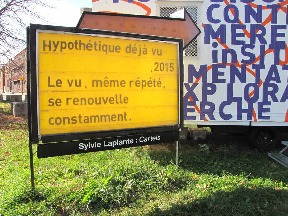 En général, dans les musées et galeries, le cartel est apposé sur le mur à côté de l'œuvre ou parfois sur l'encadrement d'une peinture. Mais sur le tertre du métro Saint-Laurent, il fait partie de l'œuvre. Dans certaines peintures anciennes, le cartellino est une représentation peinte par l'artiste dans son tableau, d'un feuillet de texte descriptif avec date et signature, un cartel intégré qui commente, ajoute et transforme comme une didascalie dans une œuvre dramaturgique.