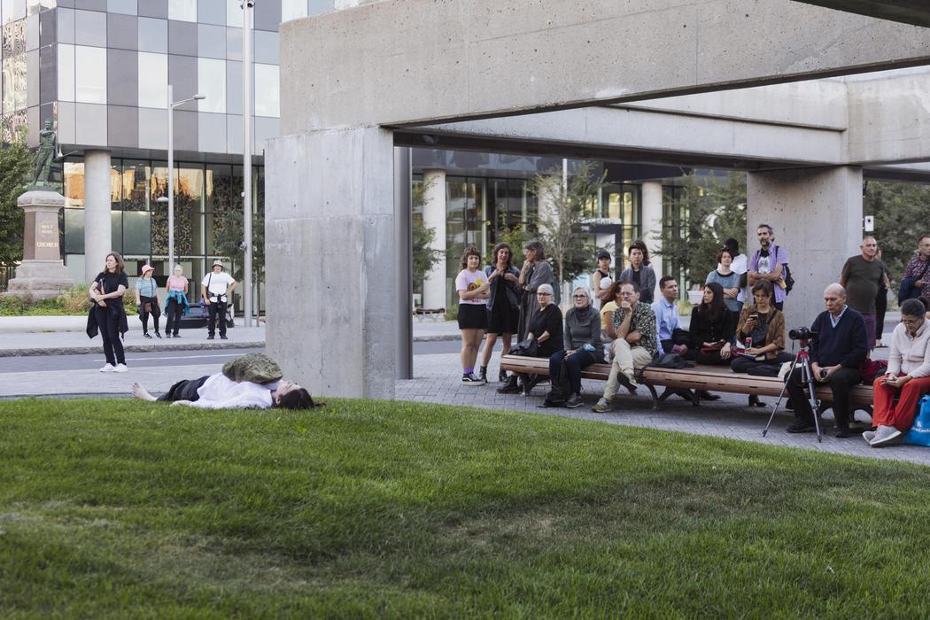L'artiste d'origine cubaine Paola Martínez Fiterre présente Breathe, une œuvre performative dans l'espace public qui teste l'endurance du corps au poids de son environnement. Pour VIVA!, l'artiste réalise sa performance au Square Viger, au coin St-Denis/St-Antoine.