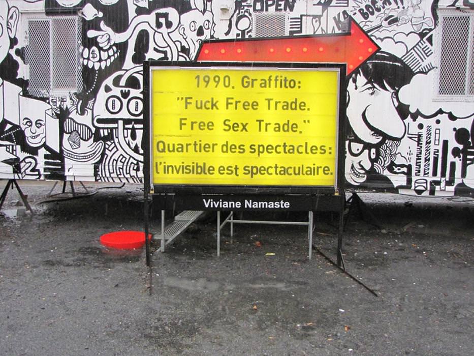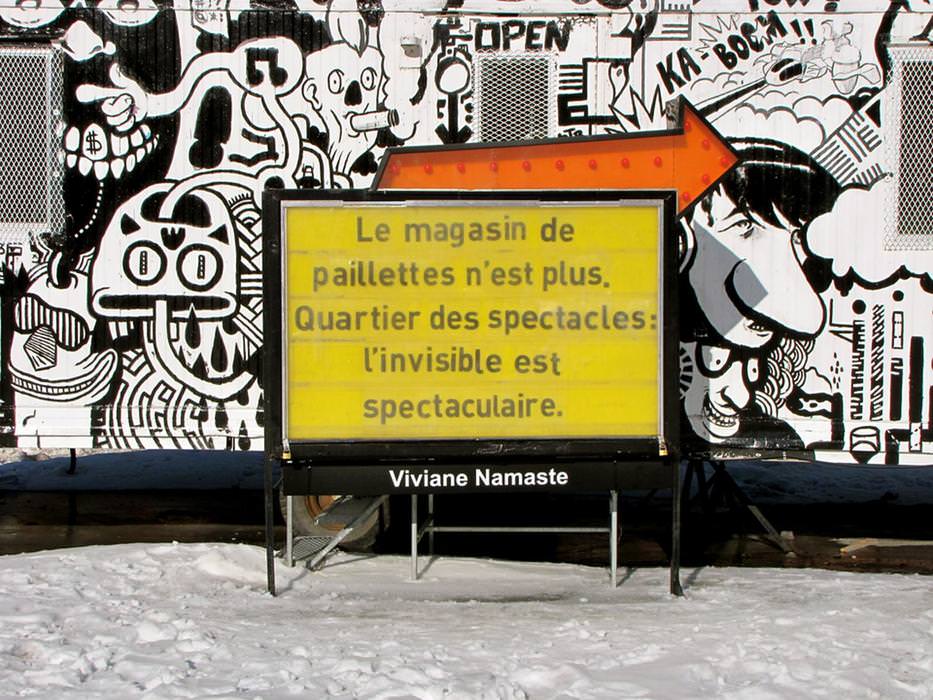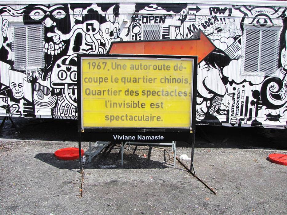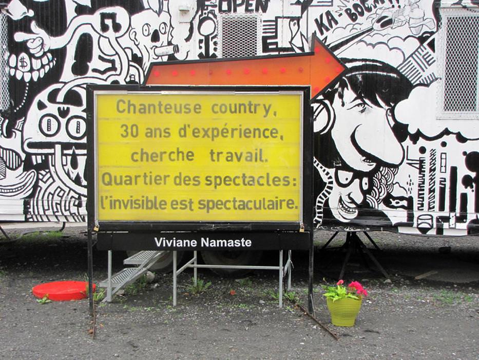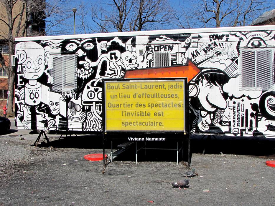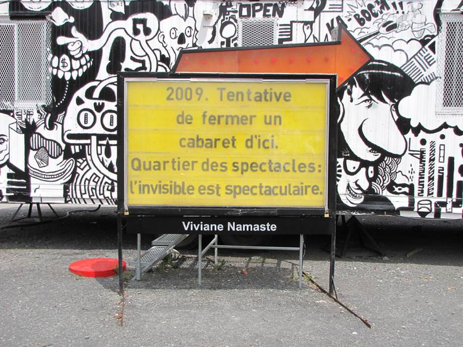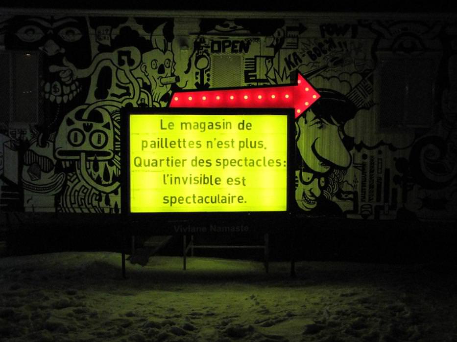 Répété chaque semaine, ce slogan s’écrit avec tous les énoncés, suggérant que la définition d’un site ne peut pas se limiter seulement au visible, mais se fond aussi sur l’invisible. Mieux encore : l’énonciation du site se fond sur le refoulement de certaines histoires et de certains énoncés. Dans une telle violence, les référents des signes sont déplacés, cédés, effacés : « Quartier des spectacles » dénote un grand festival, un concert plein air, un aménagement urbain qui permet à des centaines de milliers de personnes de se déplacer, mais « Quartier des spectacles » ne dénote plus la chanteuse country de la Main, le magasin où se vendaient des costumes d’artistes, ou bien les Tourist Rooms dans lesquels dormaient et baisaient les artistes et les travailleuses de ce quartier. Ainsi, la répétition du slogan « Quartier des spectacles : l’invisible est spectaculaire » exige que l’on réfléchisse à ce qui ne se voit pas – le déplacement des pauvres, l’expulsion des travailleuses du sexe, le chômage chez les artistes populaires du coin. L’écriture nous invite à voir, et à revoir, autrement. Le Quartier est spectaculaire non seulement pour ses spectacles visibles, mais surtout pour ce qu’on ne voit pas. L’écriture d’un slogan promotionnel souligne ces invisibilités.